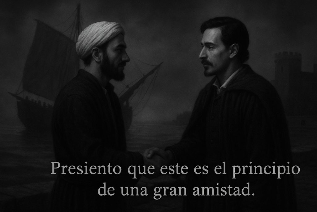 Cervantes en Argel se aproxima así mucho más al Rick que había tenido una historia previa con Ilsa. Y sería Saavedra el que tiene que dejar marchar a la pareja, quedándose en tierra mientras el barco zarpa.